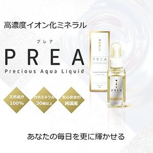 高濃度イオン化ミネラル:天然成分100%・30種類以上もの必須ミネラルを抽出した高濃度イオン化ミネラルPREA(プレア)、信頼の国内製造です。 イオン化ミネラル:イオン化ミネラルとは、ミネラルをナノメートル以下のサイズまで細分化したものです。ミネラルをイオン化することで、摂取したミネラルの体内への吸収率を上げることができます。